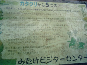 撮影者があまりのいことに戸惑い、ぶれていてわかりにくいが「はじめまして。私はカタクリという植物です」とはじまり、「ここは特別地域に指定されているようです」等人間社会の様子をかなり見聞きしていることがうかがえる。カタクリ氏の懸念は、さいきんよく人間にさらわれることだそう。人間として、そのような行為におよぶ過激派の影響で人間-カタクリ間の関係性の悪化は嘆かわしいばかり。(以下撮影者メモより)